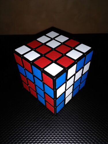 5×5 トリプル・螺旋 二か所揃っていませんが、これを揃えると内側の配置が崩れてしまいます。 二か所を揃えたのがこちら、外側は揃うのですが内側が崩れました! 通常の回し方で組み立てられれば、完全なトリプル螺旋が完成するはずです。